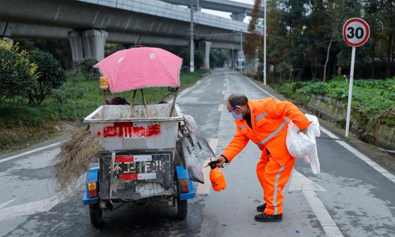 A worker sanitizes a garbage cart in Taiping Village of Pidu District in Chengdu, southwest China's Sichuan Province, Dec. 9, 2020. (Xinhua/Shen Bohan)