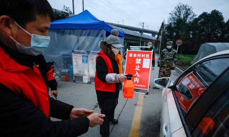 Volunteers sanitize a car at a checkpoint in Taiping Village of Pidu District in Chengdu, southwest China's Sichuan Province, Dec. 9, 2020. (Xinhua/Shen Bohan)
