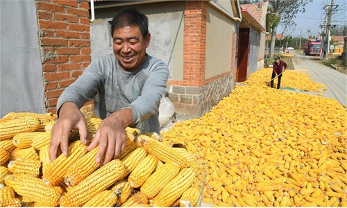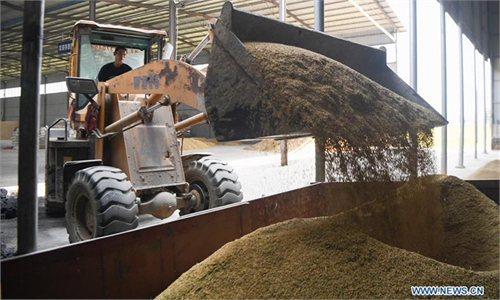 Farmers in Wuhan, Central China's Hubei Province, inspect grain on Tuesday. China's grain output will likely rise this year as the autumn harvest is generally guaranteed following bumper crops of early rice and summer grain, according to the Ministry of Agriculture and Rural Affairs. Photo: cnsphoto
