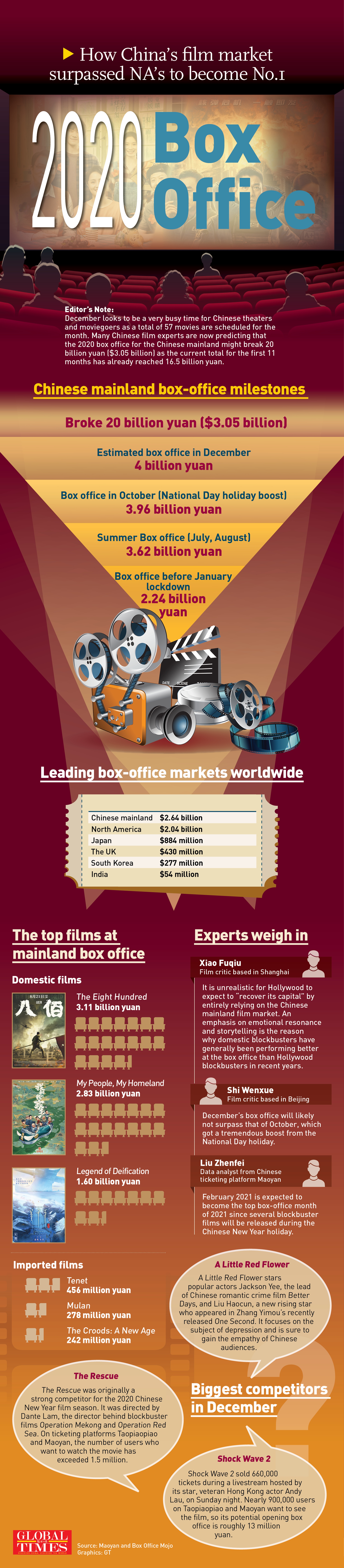 December looks to be a very busy time for Chinese theaters and moviegoers as a total of 57 movies are scheduled for the month. Many Chinese film experts are now predicting that the 2020 box office for the Chinese mainland might break 20 billion yuan ($3.05 billion) as the current total for the first 11 months has already reached 16.5 billion yuan.