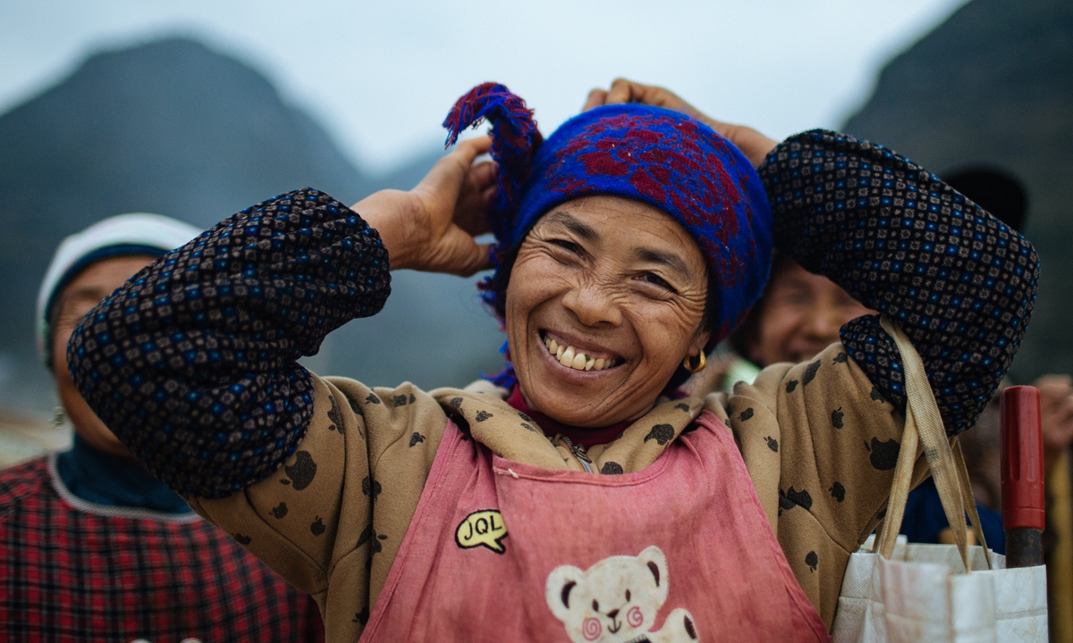 A woman who is a commuting farmer is ready to return home after a day of work in the agricultural base of Xingfuyuan, Ziyun county of Southwest China's Guizhou Province. Photo: Li Hao/GT