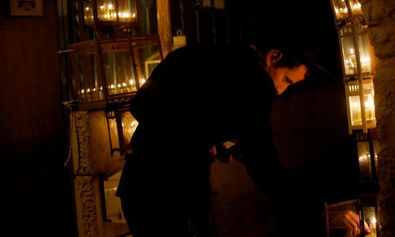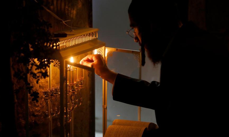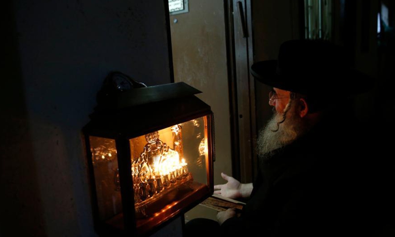An Ultra-Orthodox Jewish man lights candles during the festival of Hanukkah in Mea Shearim neighborhood in Jerusalem, on Dec. 13, 2020. Hanukkah is an important Jewish festival. (Photo by Gil Cohen Magen/Xinhua)