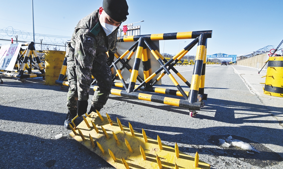 A South Korean soldier sets a barricade at a checkpoint on the Tongil bridge, the road leading to North Korea's Kaesong joint industrial complex, near the Demilitarized Zone dividing the two Koreas in Paju, a South Korean border city on Tuesday. The barrier rises a day after South Korea's parliament passed a law criminalizing sending anti-Pyongyang leaflets into the North. Photo: AFP