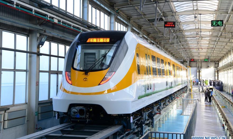Photo taken on Dec. 15, 2020 shows a new type of middle-to-low-speed magnetic-levitation train finished in Changchun City of northeast China's Jilin Province. Chinese train maker CRRC Changchun Railway Vehicles Co., Ltd. on Tuesday rolled out a new type of middle-to-low-speed magnetic-levitation train. The train, with a maximum operational speed of 120 km per hour, will be deployed on a tourist route in Qingyuan City, south China's Guangdong Province, according to the company. (Xinhua)