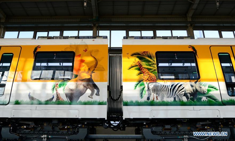 Photo taken on Dec. 15, 2020 shows the exterior painting of a new type of middle-to-low-speed magnetic-levitation train finished in Changchun City of northeast China's Jilin Province. Chinese train maker CRRC Changchun Railway Vehicles Co., Ltd. on Tuesday rolled out a new type of middle-to-low-speed magnetic-levitation train. The train, with a maximum operational speed of 120 km per hour, will be deployed on a tourist route in Qingyuan City, south China's Guangdong Province, according to the company. TO GO WITH:"China develops new middle-to-low-speed maglev train" (Xinhua)