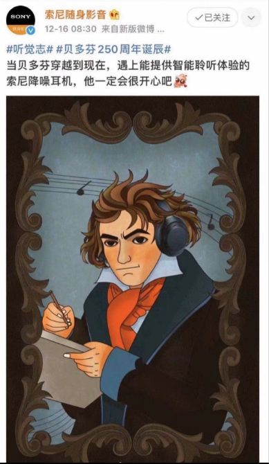 "If Beethoven could travel the time tunnel to the present, the master must feel elated while he comes across Sony's noise-canceling headphones, for the device's ability to provide an extravagant listening experience," read a statement posted under the official account for Sony audio products which appeared on Wednesday morning.