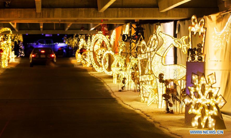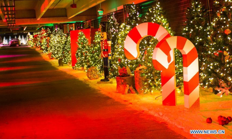 Christmas decorations and lights are seen as visitors drive their cars to a drive-thru Christmas-themed light show "Polar Drive" in Toronto, Canada, Dec. 15, 2020. (Photo by Zou Zheng/Xinhua)