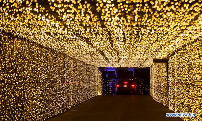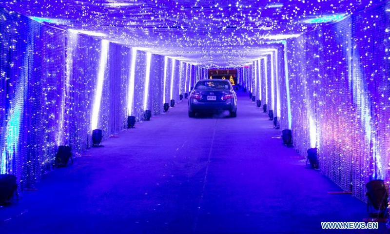 Visitors drive their cars to go through a light tunnel at the Christmas-themed drive-thru light show "Polar Drive" in Toronto, Canada, Dec. 15, 2020. (Photo by Zou Zheng/Xinhua)