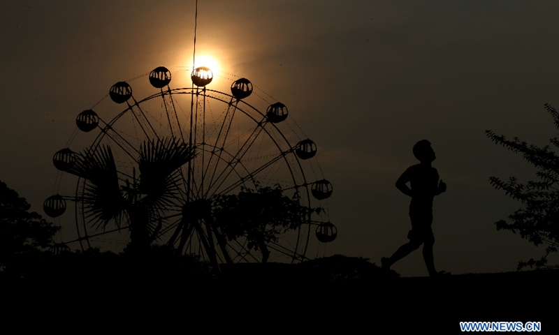 A man does exercises in sunset on the bank of Inya lake in Yangon, Myanmar, Dec. 18, 2020.Photo:Xinhua