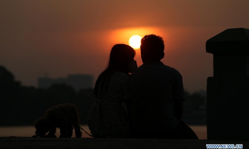 A couple enjoy the sunset with their pet on the bank of Inya lake in Yangon, Myanmar, Dec. 18, 2020.Photo:Xinhua
