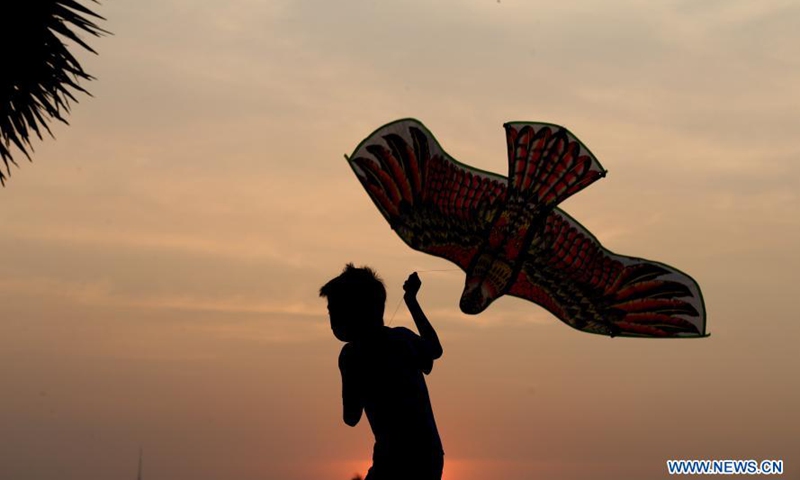 A boy flies his kite in sunset on the bank of Inya lake in Yangon, Myanmar, Dec. 18, 2020.Photo:Xinhua