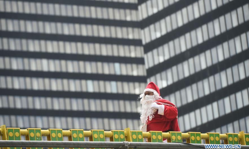 A man dressed in Santa Claus costume walks on a street in Jakarta, Indonesia, Dec. 19, 2020.Photo:Xinhua