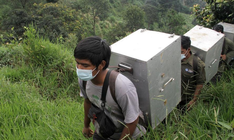 Members of International Animal Rescue (IAR) Indonesia carry Javan slow lorises in boxes to release them to the wild at Mount Halimun Salak, West Java, Indonesia, Dec. 20, 2020. Fifteen Javan slow lorises have been released to the wild at Mount Halimun Salak after receiving treatment at IAR Indonesia rehabilitation centre. (Photo by Dedy Istanto/Xinhua)