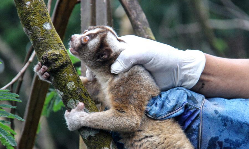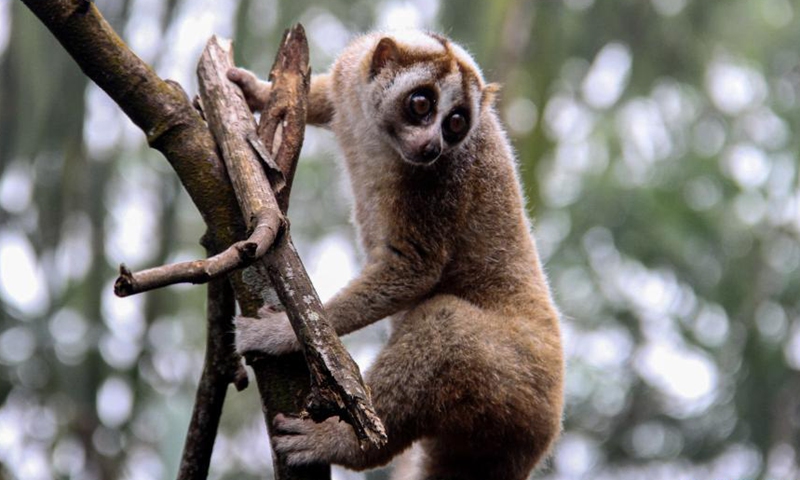 A Javan slow loris climbs a tree after being released to the wild at Mount Halimun Salak, West Java, Indonesia, Dec. 20, 2020. Fifteen Javan slow lorises have been released to the wild at Mount Halimun Salak after receiving treatment at International Animal Rescue Indonesia rehabilitation centre. (Photo by Dedy Istanto/Xinhua)