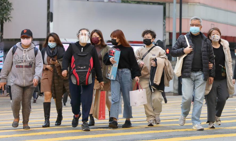 Pedestrians wearing face masks walk on a street in Hong Kong, south China, Dec. 20, 2020. Hong Kong's Center for Health Protection (CHP) reported 74 confirmed cases of COVID-19 on Sunday, taking its total tally to 8,152. The new confirmed cases included 70 local infections, with 25 cases of unknown origin. (Xinhua/Wu Xiaochu)
