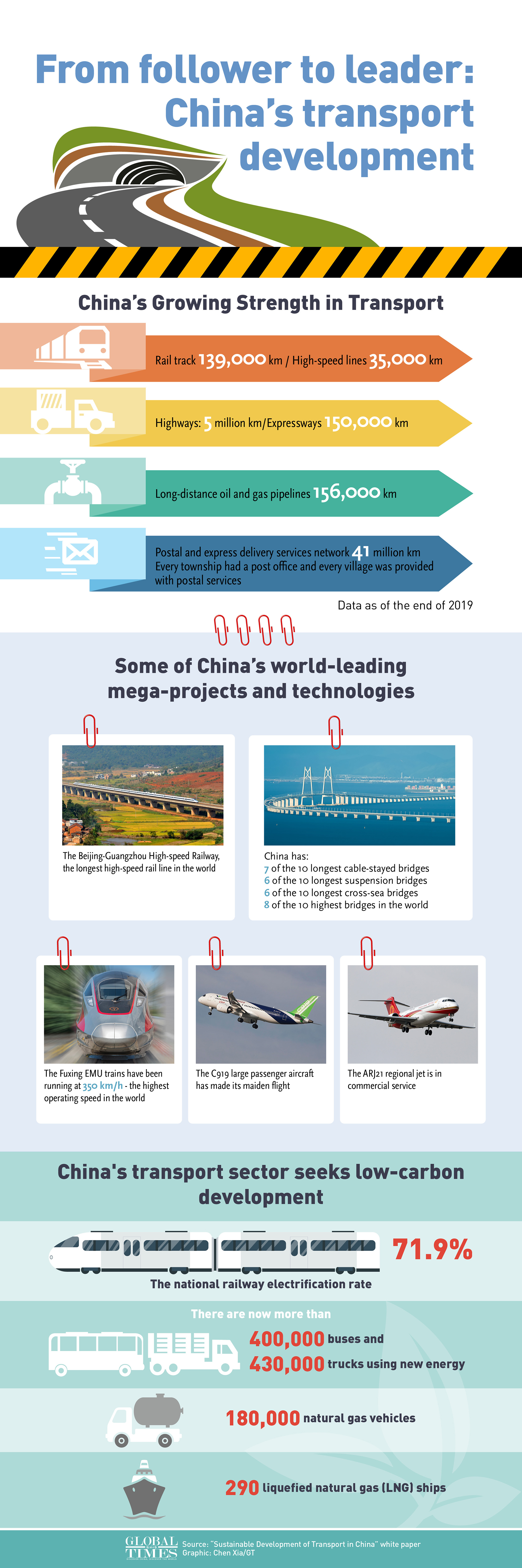 With the world’s longest high-speed railway and postal services that reach every remote village, China has built a comprehensive transportation network and completed a "giant leap" from being a follower to a leader in the world’s transport technology. Graphic:Chen Xia/GT