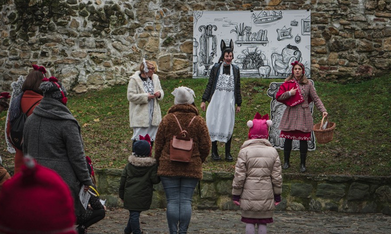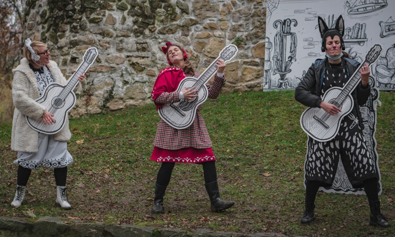 Artists of the Poco Loco Theatre perform in an adaptation of the classic tale "Little Red Riding Hood" in a park in Zagreb, Croatia, Dec. 6, 2020. (Photo by Kresimir Saric/Xinhua)