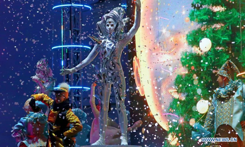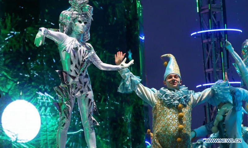 Actors perform during an outdoor drama performance to welcome the upcoming New Year's Day on a square in downtown Minsk, Belarus, Dec. 26, 2020. (Photo by Henadz Zhinkov/Xinhua)