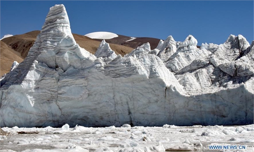 Wang Xiangjun explores a glacier in Bomi county, Southwest China's Tibet Autonomous Region in November 2017. Photo: Courtesy of Wang Xiangjun