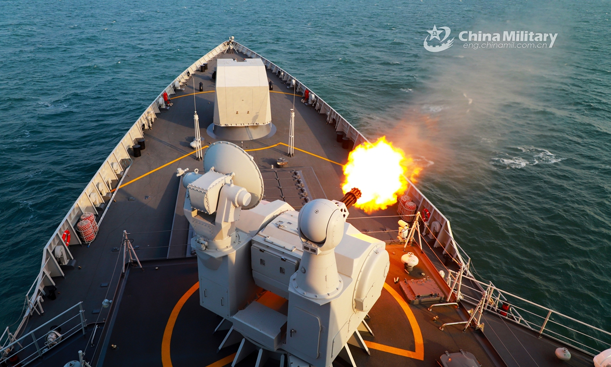 The guided-missile destroyer Qiqihar (Hull 121) attached to the navy under the PLA Northern Theater Command fires its close-in weapons system at mock aerial targets during a maritime live-fire training exercise in mid December, 2020. (eng.chinamil.com.cn/Photo by Zhang Hailong)