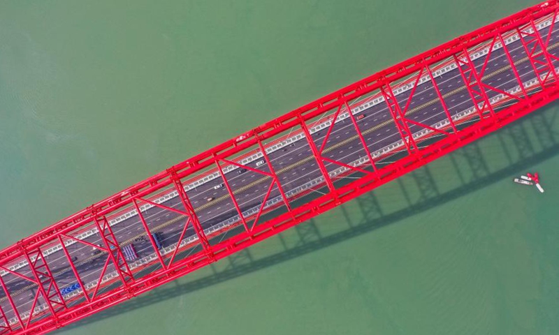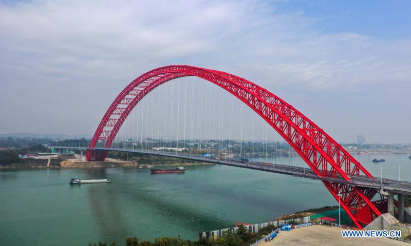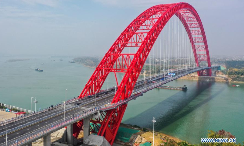 Aerial photo taken on Dec. 28, 2020 shows a view of the Third Pingnan Bridge in Pingnan County, Guigang City of south China's Guangxi Zhuang Autonomous Region. With a length of 1,035 meters, the bridge, whose construction started from June of 2018, was completed and opened to traffic on Monday. (Xinhua/Cao Yiming)