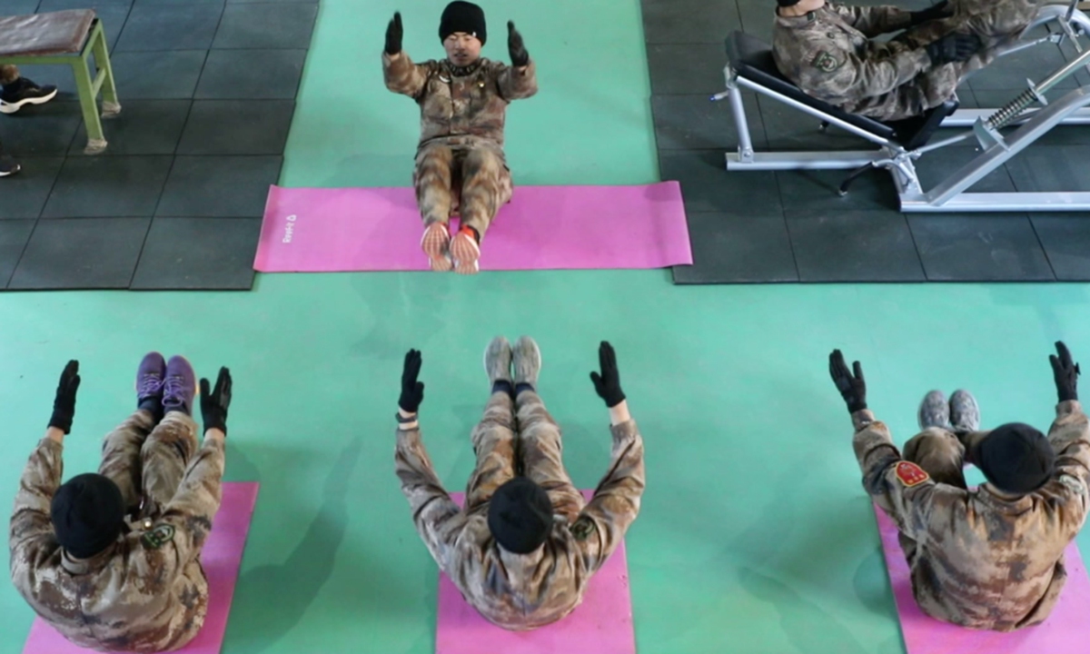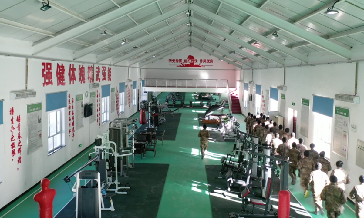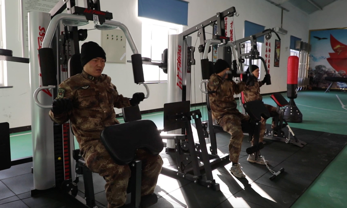 Border soldiers stationed at Bedel Pass in Northwest China's Xinjiang Uygur Autonomous Region have daily exercise in an indoor gym.