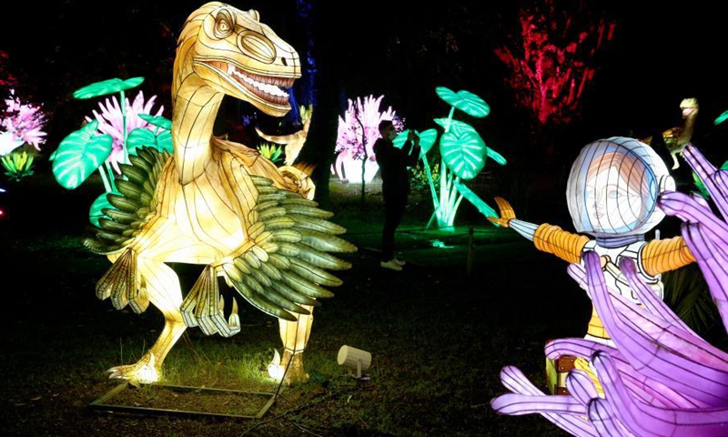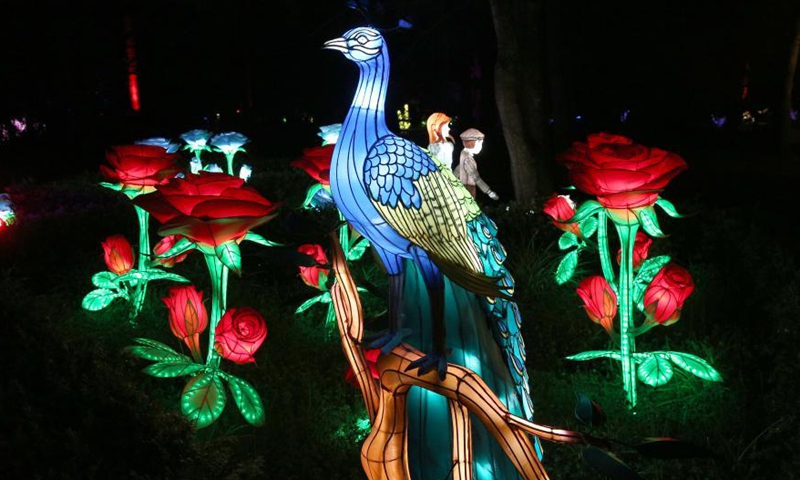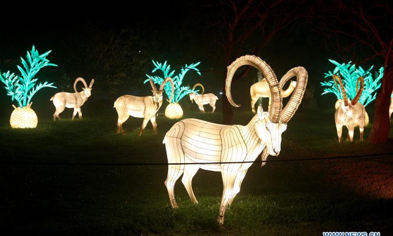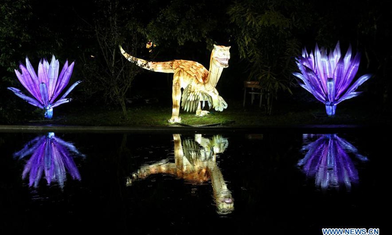 Photo taken on Dec. 28, 2020 shows the illumination installations at a lantern show named "Magical Garden" at the Tropical Botanical Garden in Lisbon, Portugal. The exhibition will run until Jan. 10, 2021. (Photo by Pedro Fiuza/Xinhua)
