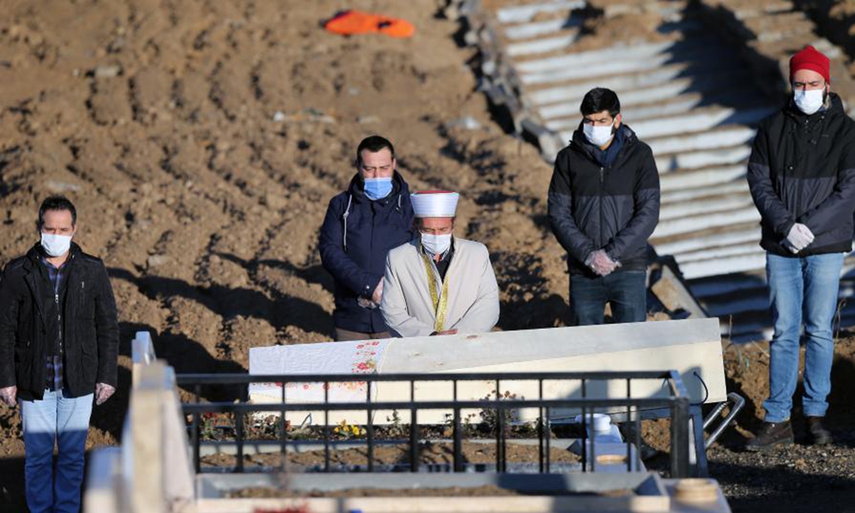 People attend the funeral of a COVID-19 victim at Ortakoy cemetery in Ankara, Turkey, on Dec. 29, 2020. In Turkey, the total COVID-19 cases surged to 2,178,580 while the death toll from the disease climbed to 20,388 after 253 more fatalities were confirmed. The tally of recoveries in Turkey rose by 21,004 to 2,058,437. (Photo by Mustafa Kaya/Xinhua)
