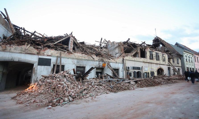 Destroyed buildings are seen after an earthquake in Petrinja, a small city about 50 km southeast of Zagreb, Croatia, on Dec. 29, 2020. A strong 6.4 magnitude earthquake jolted Petrinja at 12:19 p.m. local time (1119 GMT) on Tuesday, the European-Mediterranean Seismological Centre (EMSC) said. (Luka Stanzl/Pixsell via Xinhua)