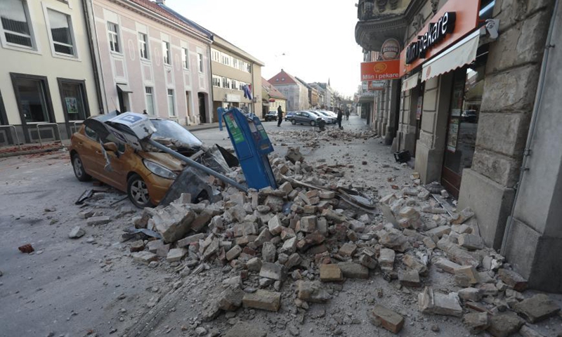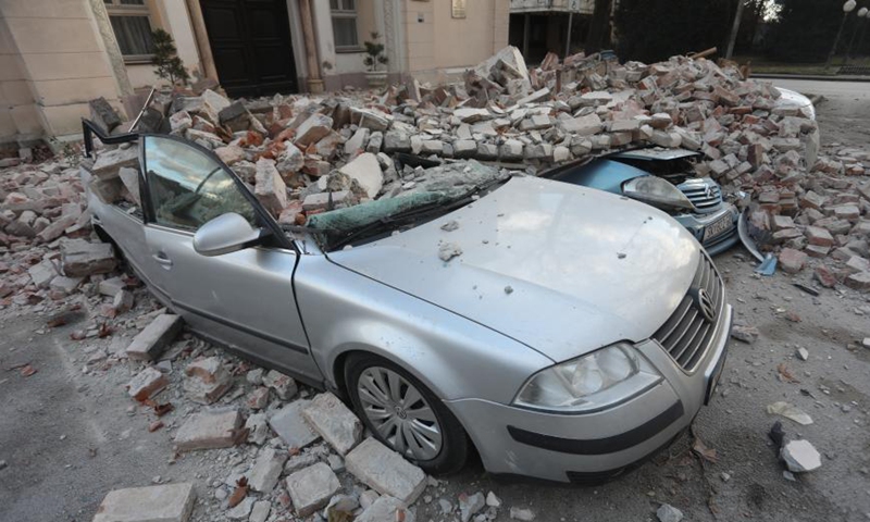 A damaged vehicle is seen after an earthquake in Sisak, Croatia, on Dec. 29, 2020. A strong 6.4 magnitude earthquake jolted Petrinja, a small city about 50 km southeast of the Croatian capital Zagreb, at 12:19 p.m. local time (1119 GMT) on Tuesday, the European-Mediterranean Seismological Centre (EMSC) said. (Marin Tironi/Pixsell via Xinhua)