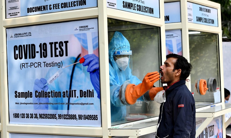 A health worker collects a swab from a man during a COVID-19 test in New Delhi, India, on Nov. 6, 2020.File photo:Xinhua