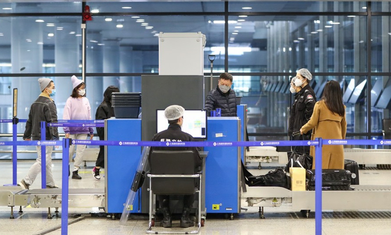 Passengers pass security checkpoint at Terminal 2 building of the Shanghai Pudong International Airport in east China's Shanghai, Nov. 24, 2020.Photo:Xinhua