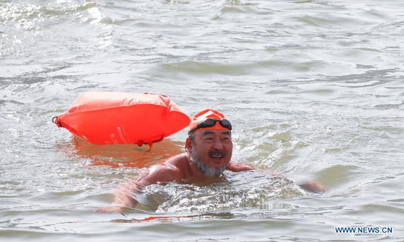 A swimmer takes part in a winter swimming event in the Yellow River in Lanzhou, northwest China's Gansu Province, Jan. 1, 2021. (Xinhua/Du Zheyu)
