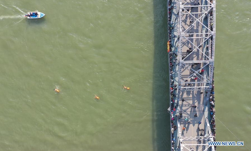 Aerial photo taken on Jan. 1, 2021 shows swimmers taking part in a winter swimming event in the Yellow River in Lanzhou, northwest China's Gansu Province. (Xinhua/Du Zheyu)