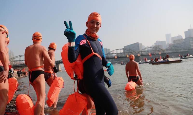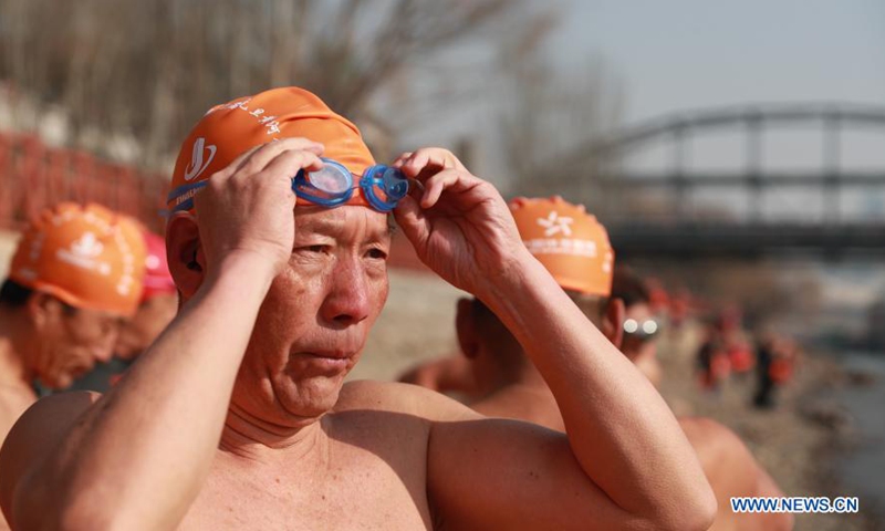 A swimmer prepares before a winter swimming event in the Yellow River in Lanzhou, northwest China's Gansu Province, Jan. 1, 2021. (Xinhua/Du Zheyu)
