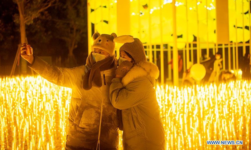 Tourists take a selfie at the Happy Valley Wuhan theme park in Wuhan, central China's Hubei Province, Jan. 1, 2021. People came to have fun and enjoy the view at the Happy Valley in Wuhan to greet the New Year on Friday. (Xinhua/Xiong Qi)