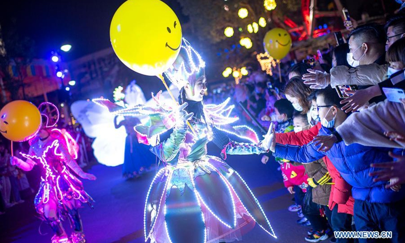 Performers interact with tourists at the Happy Valley Wuhan theme park in Wuhan, central China's Hubei Province, Jan. 1, 2021. People came to have fun and enjoy the view at the Happy Valley in Wuhan to greet the New Year on Friday. (Xinhua/Xiong Qi)
