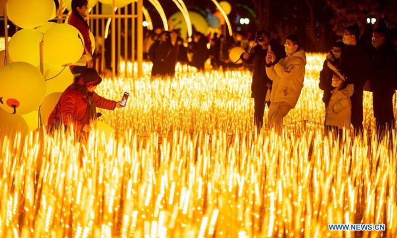 Tourists pose for photos at the Happy Valley Wuhan theme park in Wuhan, central China's Hubei Province, Jan. 1, 2021. People came to have fun and enjoy the view at the Happy Valley in Wuhan to greet the New Year on Friday. (Xinhua/Xiong Qi)