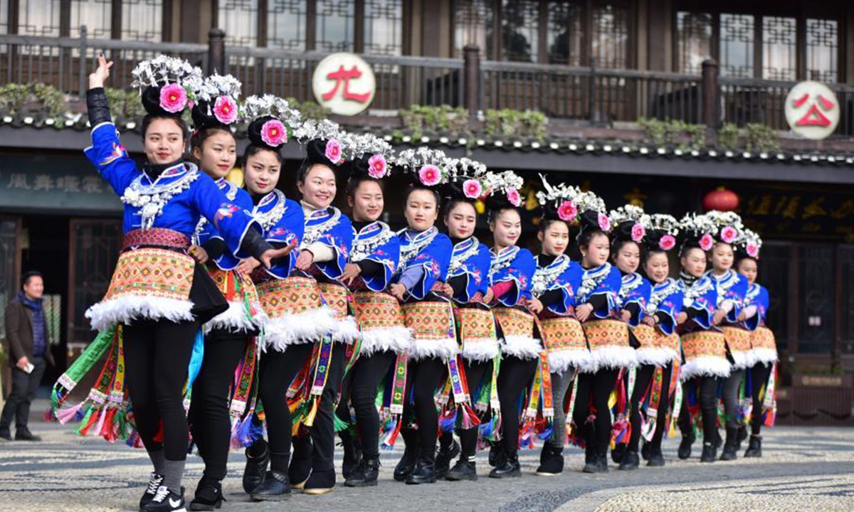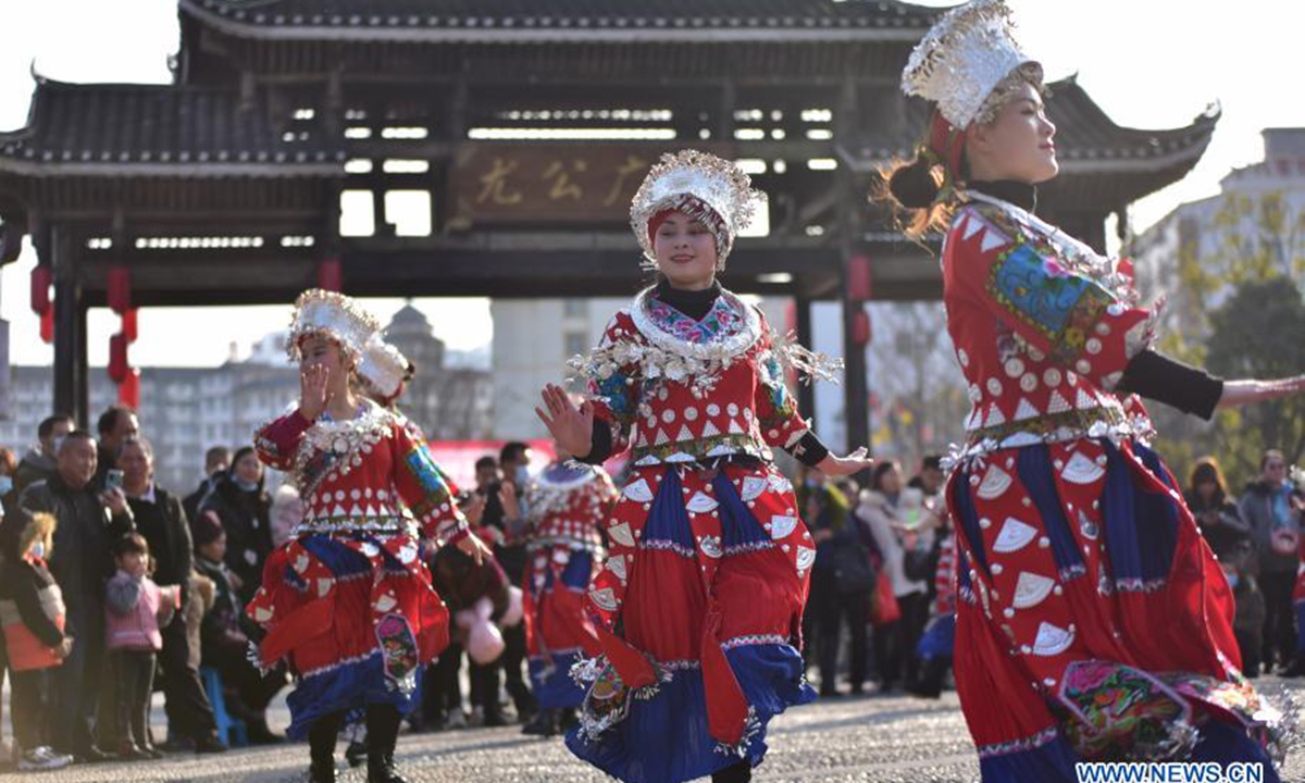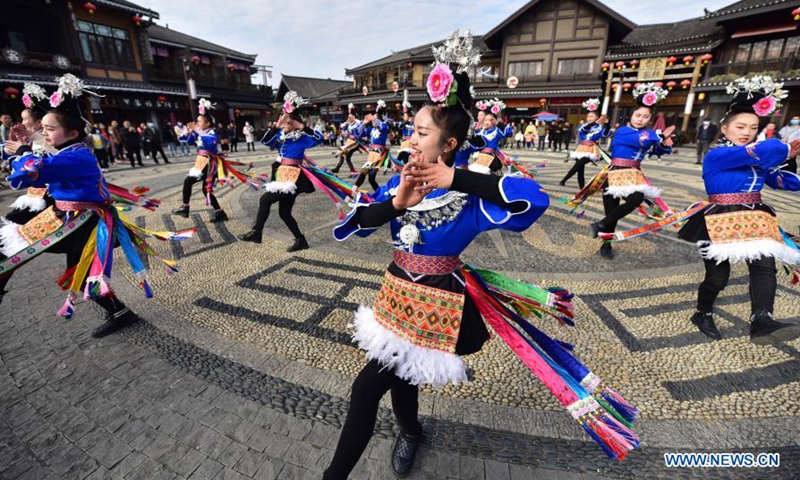 Villagers wearing traditional costumes perform folk dance at the Danzhai Wanda Town in Danzhai County, Qiandongnan Miao and Dong Autonomous Prefecture, southwest China's Guizhou Province, Jan. 1, 2021. Many people came to visit Danzhai Wanda Town to experience the Miao custom on the New Year's Day. (Photo by Yang Wukui/Xinhua)