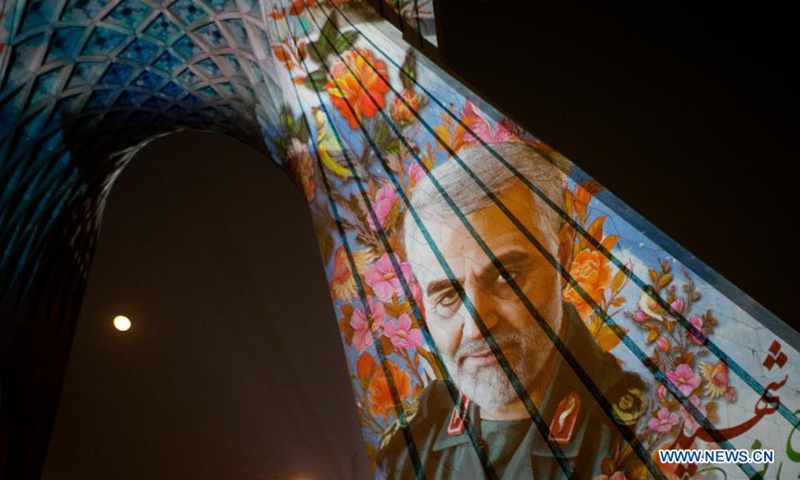 The Azadi Tower is illuminated in Tehran, Iran, on Jan 1, 2021, during a ceremony on the occasion of first anniversary of death of Qassem Soleimani, former commander of the Quds Force of Iran's Islamic Revolution Guards Corps (IRGC). (Photo by Ahmad Halabisaz/Xinhua)