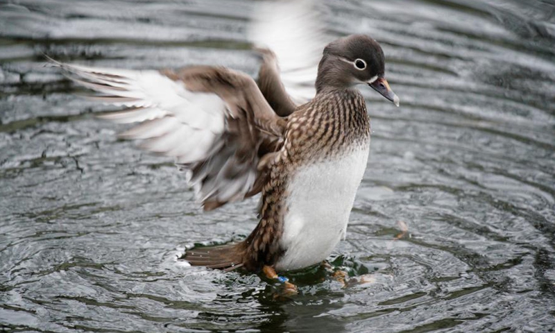 A mandarin duck flaps its wings in the Royal Baths park in Warsaw, Poland, Dec. 31, 2020. (Photo by Jaap Arriens/Xinhua)