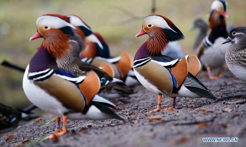A flock of mandarin ducks are seen in the Royal Baths park in Warsaw, Poland, Dec. 31, 2020. (Photo by Jaap Arriens/Xinhua)