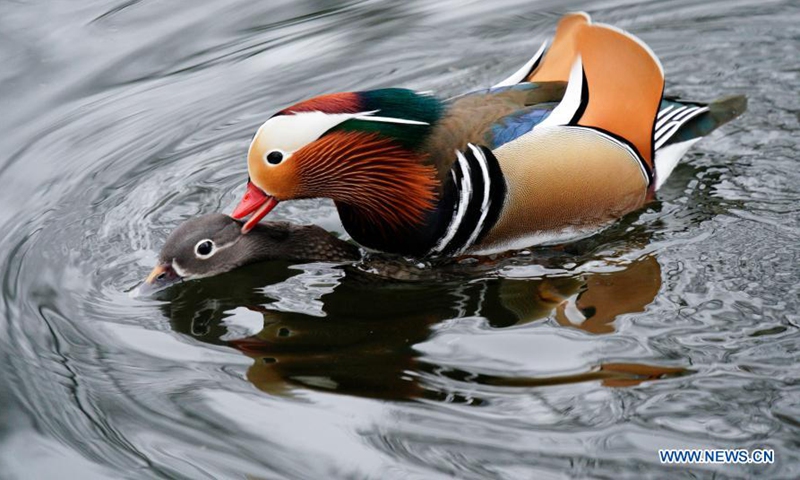 A male mandarin duck courts a female in the Royal Baths park in Warsaw, Poland, Dec. 31, 2020. (Photo by Jaap Arriens/Xinhua)