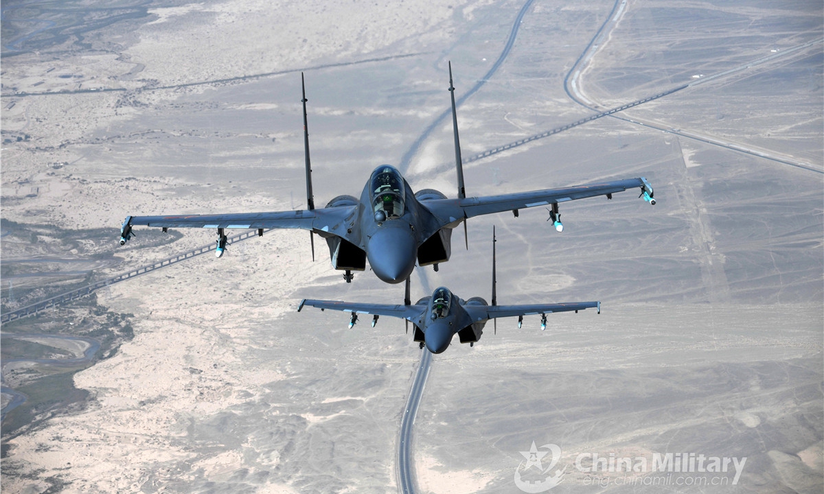 Two fighter jets attached to an aviation unit under the PLA Air Force fly in line astern formation during a combat flight operation in 2020. (Photo: eng.chinamil.com.cn)