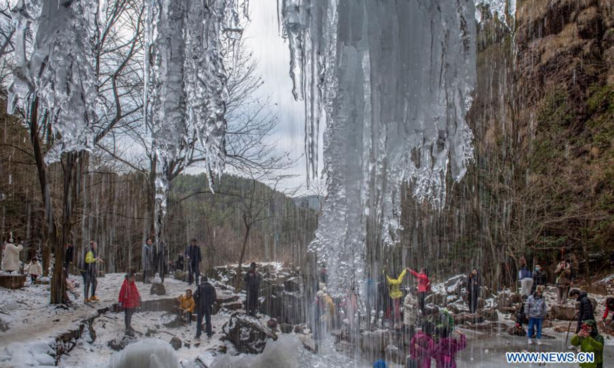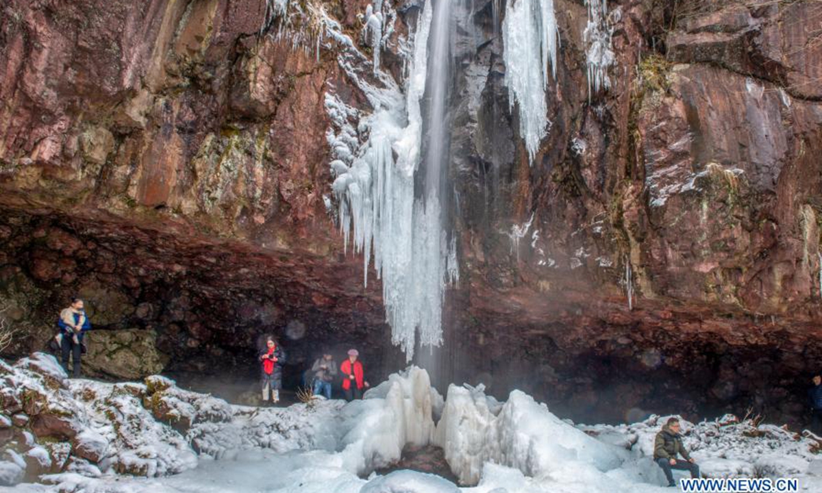 People enjoy the scenery of a frozen waterfall at Siming Mountain in Yuyao City, east China's Zhejiang Province, Jan. 3, 2021. (Photo by Zhang Hui/Xinhua)