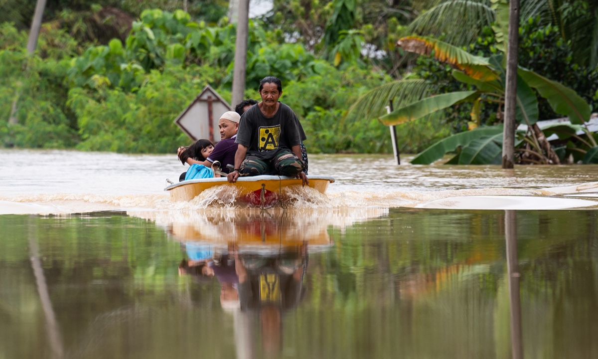 A boat carries a family through floodwaters in Lanchang in Malaysia's Pahang state on Monday. More than 3,200 people have been evacuated to relief centers following floods caused by continuous heavy rain in the region since Saturday. Photo: AFP