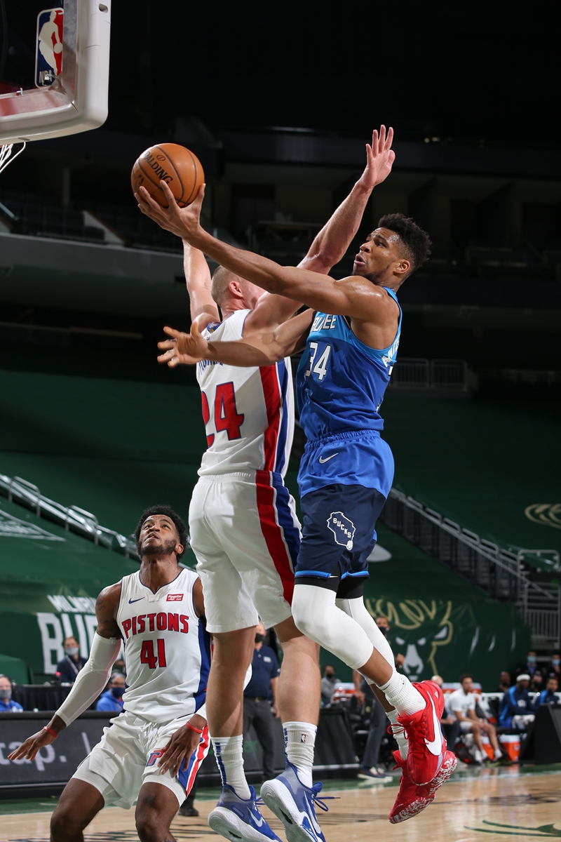 Giannis Antetokounmpo of the Milwaukee Bucks drives to the basket against the Detroit Pistons on Monday in Milwaukee, Wisconsin. Photo: VCG