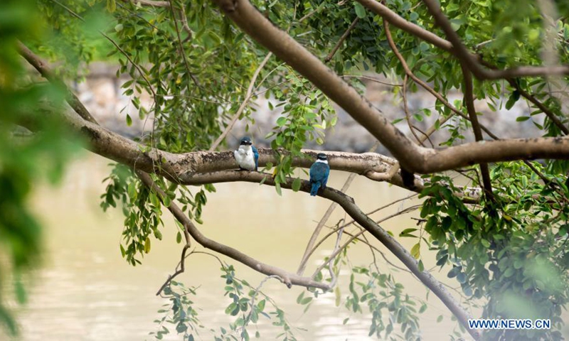 A pair of white-collared kingfishers rest on a tree next to Jiak Kim Bridge along Singapore River in Singapore, Jan. 5, 2021. (Xinhua/Then Chih Wey)