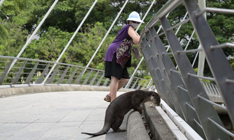 A wild smooth-coated otter sniffs around on Jiak Kim Bridge along Singapore River in Singapore, Jan. 5, 2021. (Xinhua/Then Chih Wey)
