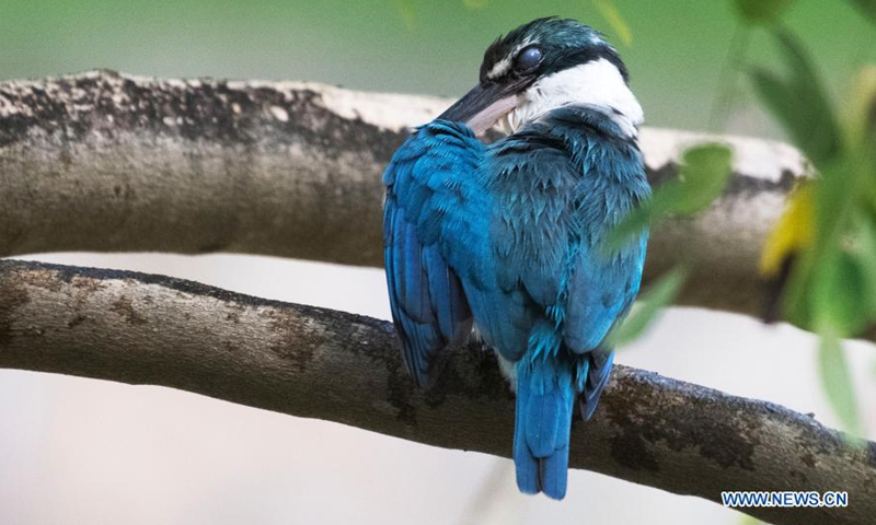 A white-collared kingfisher preens itself on a tree next to Jiak Kim Bridge along Singapore River in Singapore, Jan. 5, 2021. (Xinhua/Then Chih Wey)